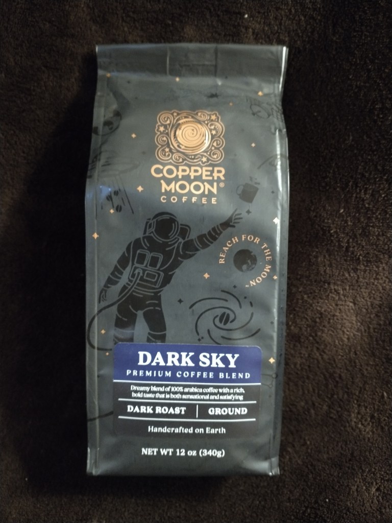 While it doesn’t affect the taste, I have to point out Copper Moon’s artwork. It’s a funny astronaut reaching for a cup of coffee in space (so the cup would not be steaming, but we’ll ignore that for now), and instead of using color it’s displayed using a difference in texture. It’s a subtle detail and I appreciate little things like that.