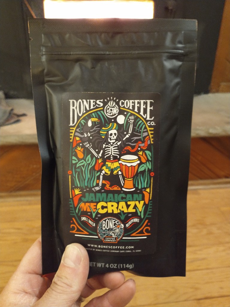 Part 2 of my coffee flight from Bones. I selected based on bag art – their signature skeleton dude wearing a Rasta hat and hanging out in the jungle with his bongo and a bunch of jungle flora and fauna caught my eye. Also, once in college my Jamaican professor gifted us sampler bags from his home town in the islands and I remember being a fan.